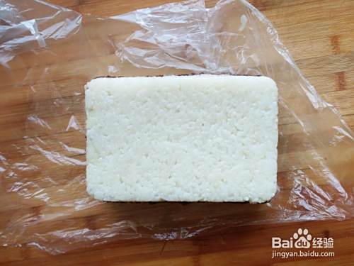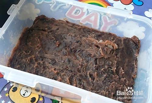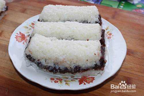 容器刷油,铺上一层糯米,然后铺上一层豆沙,最后再铺上一层糯米。
