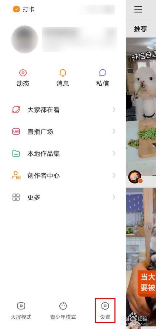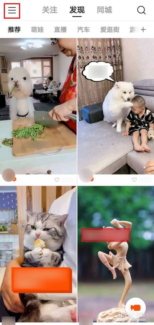 在手机里找到快手APP,打开APP默认页面是发现页,这里主要是推荐的视频,点击左上角的“三”;