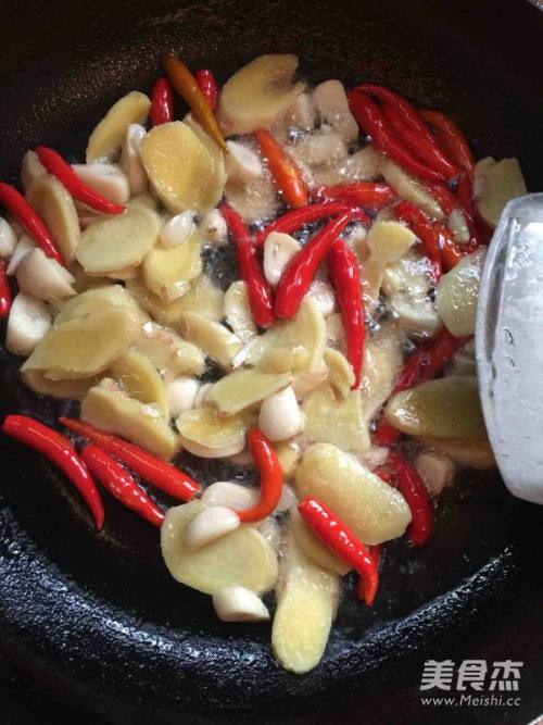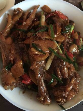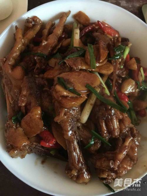热锅下油爆姜、蒜、尖椒,倒入炖好的鸡爪带少许汤闷一会儿