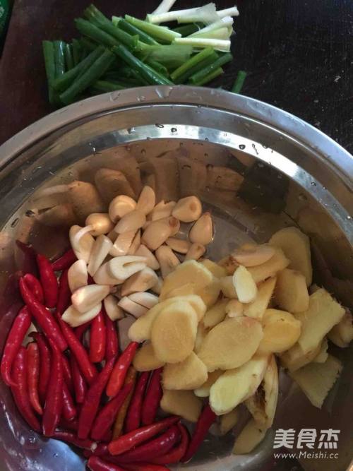 姜切成片、蒜切成粒、葱切段