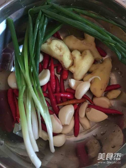 葱、姜、蒜、红尖椒洗净备用,鸡爪焯水沥干