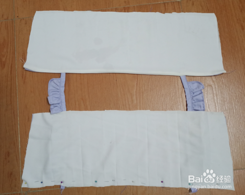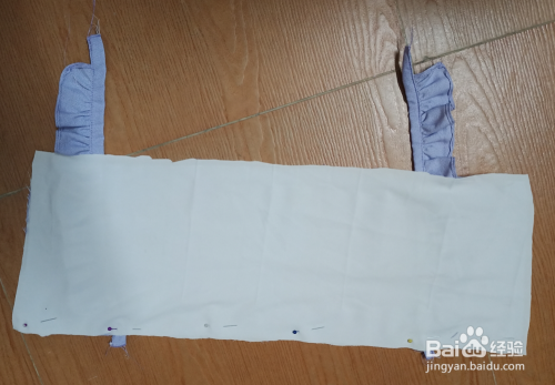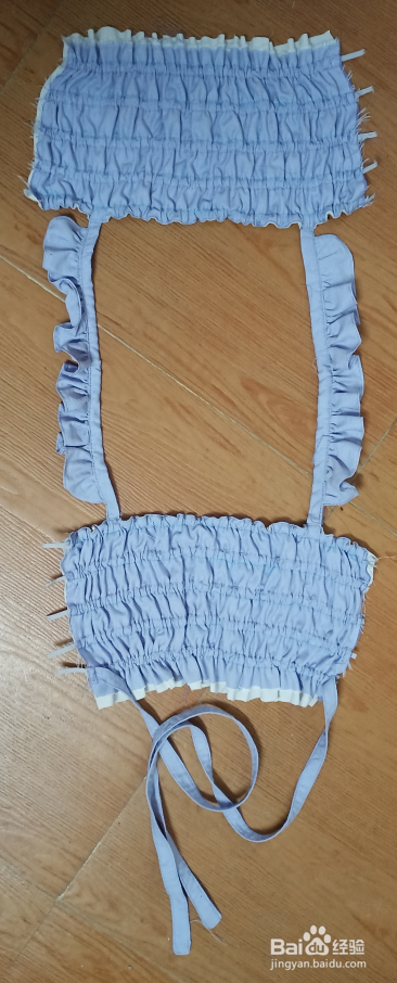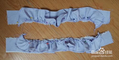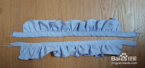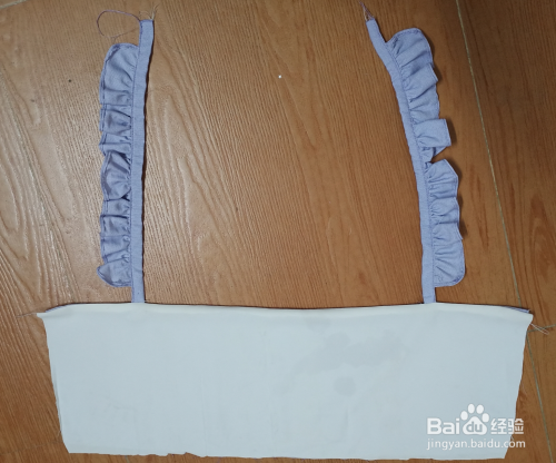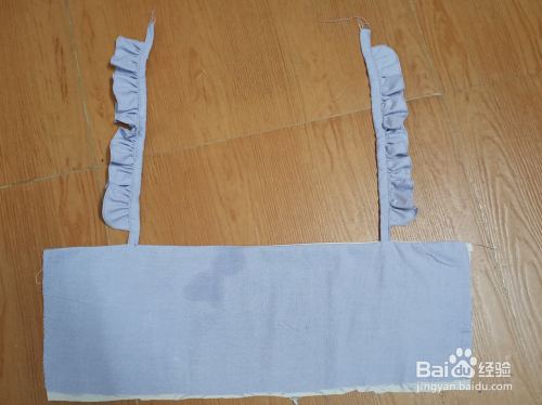 将肩带上的花边布料一头锁边,另一头抽褶。