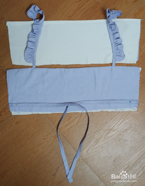 将另一份裙上半身的布料和里布,正面相对,反面朝上放置,将肩带夹在里面。