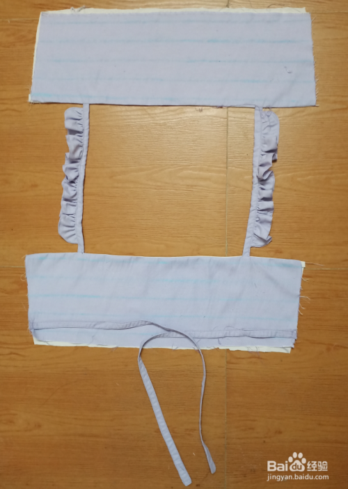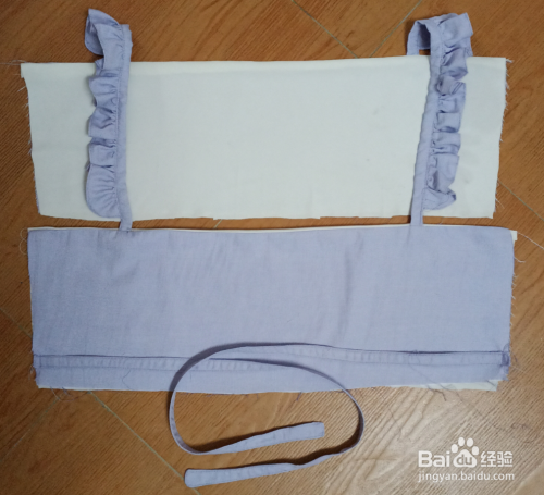 裁剪出两条布料,两头剪出弧度,作为肩带上的花边。