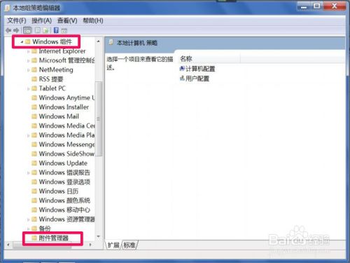 再在管理模板下,依次打开“Windows组件”->"附件管理器"。