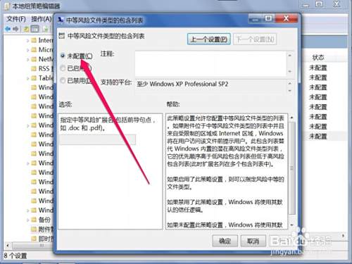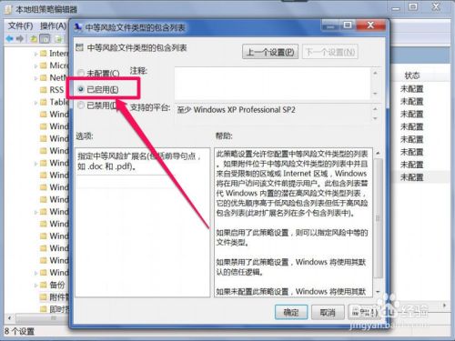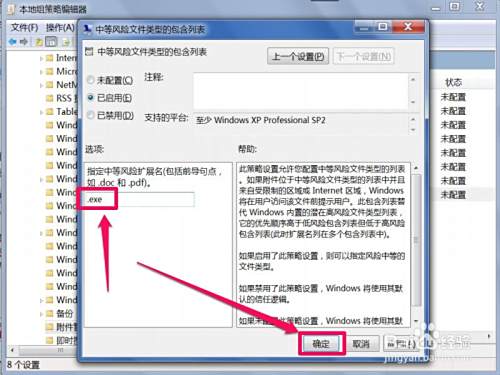 然后在“指定中等风险扩展名”中,把可执行文件的扩展名“.exe”输入进去,确定。重启电脑,以后就不会有警告提示。