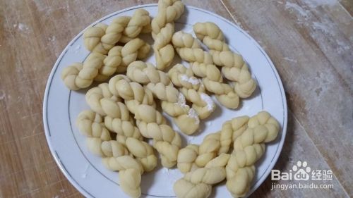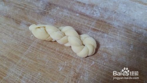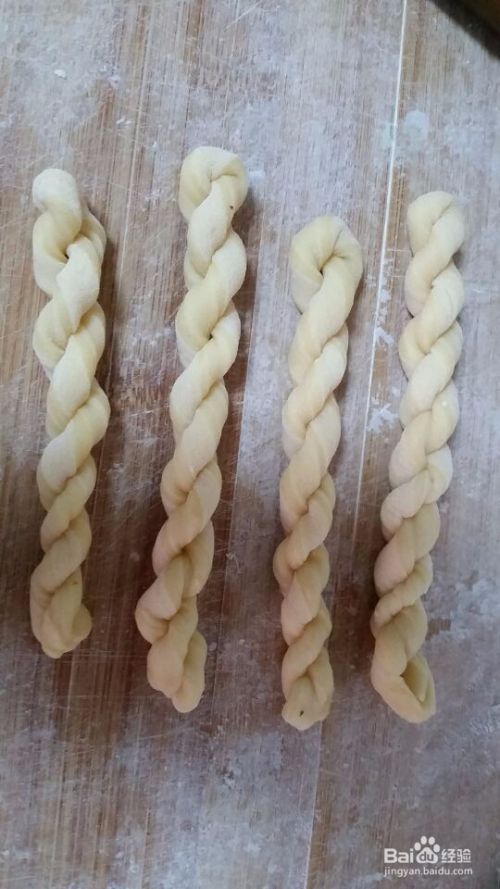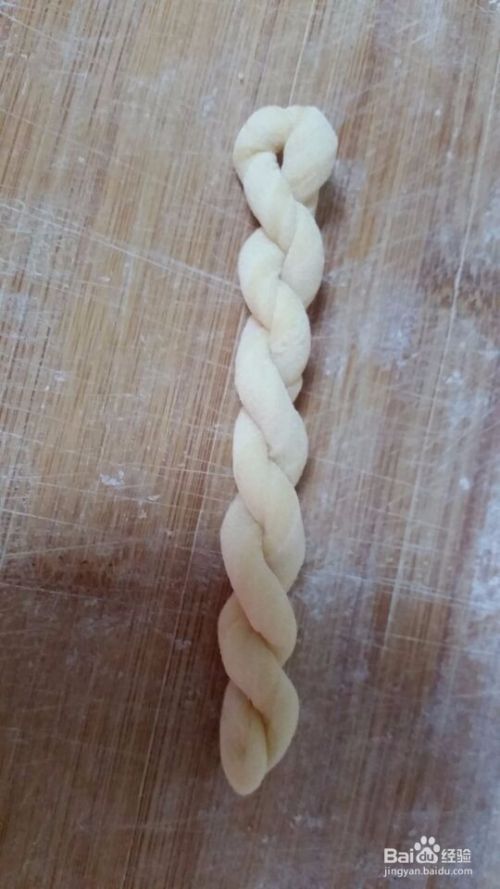 下面开始卷麻花。首先把细长条揉圆,然后拿起一根长条,一手捏一头,向相反的方向拧,一直拧一直拧,然后对折,它会自动交缠在一起。