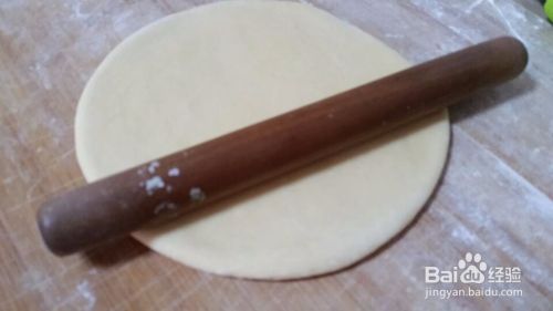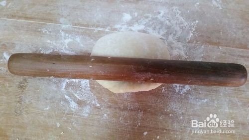 面团醒好后,拿出来,放在案板上,用擀面杖擀成大约0.8厘米厚的面饼(注意不要太薄,面饼太薄,不容易卷)。