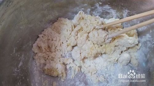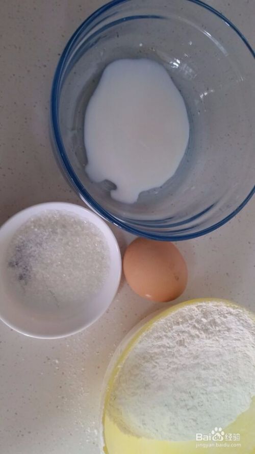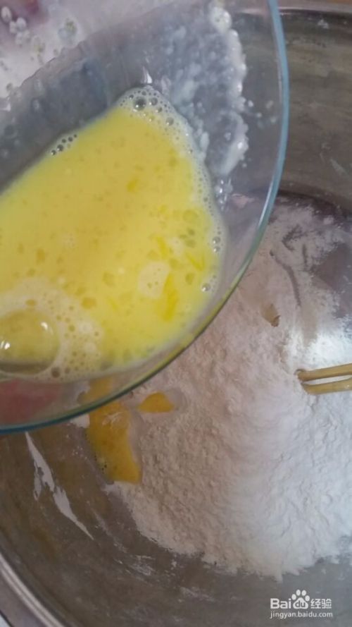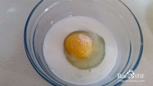 将鸡蛋打碎在盛奶的碗里,将白糖全部加进奶中,充分搅拌,可以加一点盐,提味。将蛋奶混合液,倒入面粉中,和面。