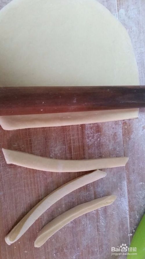用擀面杖当尺子,用刀将面饼切成细细的长条。