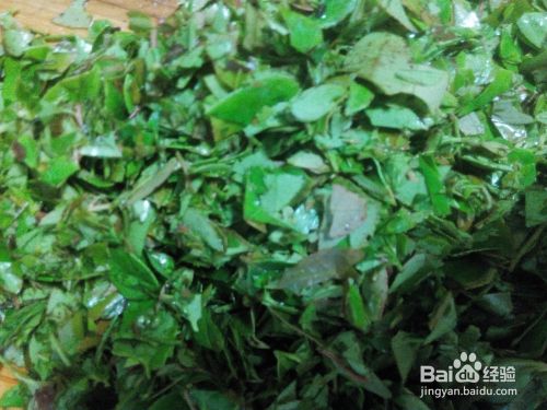 我这里是市场上买的乌饭叶,有些人有兴趣出去春游的时候也可以从乌树上采下来。把乌树叶清洗干净。然后切碎,再把它泡入淘米水中。泡它一个晚上。