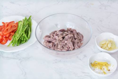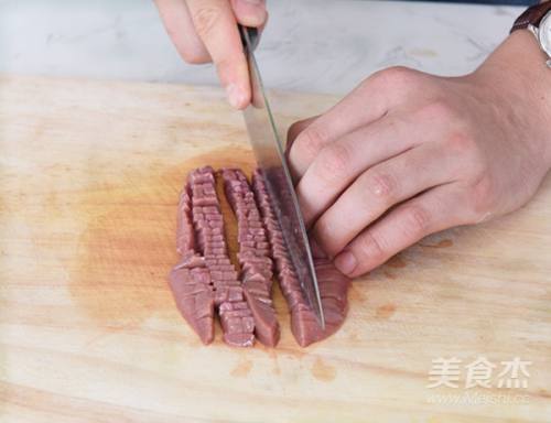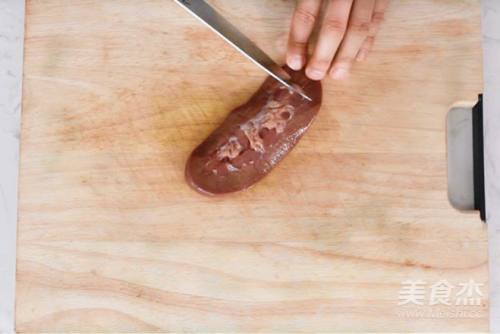 2切腰花,先横向切细片,再竖向切细片,然后放入清水中洗干净血水,沥干。加入约2勺料酒、半勺白醋,1勺红薯粉,搅拌均匀后腌制20分钟左右