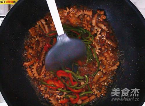 4锅中热油,倒入青红椒丝翻炒,至断生捞出备用