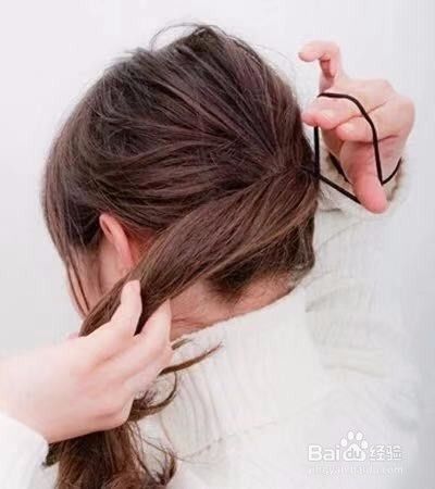 从扎好的马尾中取出一束头发,然后缠绕橡皮筋,这样可以遮住橡皮筋也显美范儿,至发尾用黑色小发夹固定好,这样就完成了。