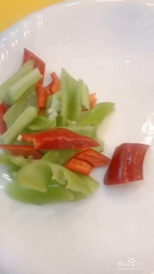 100克青红辣椒切成段,起锅烧油,油温6成热下入猪肉炸至定型捞出,油温升高再复炸,炸制外焦里嫩。