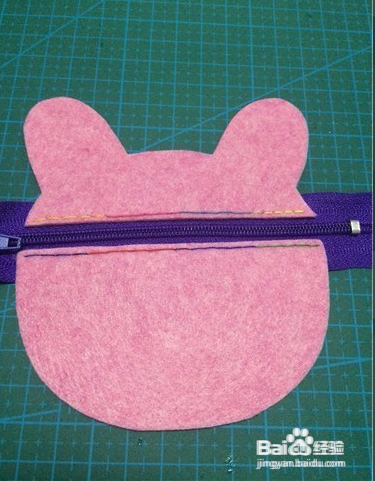 取粉色不织布一张,与步骤一得到的重叠放置,中间夹上拉链,沿着边用平针缝合。