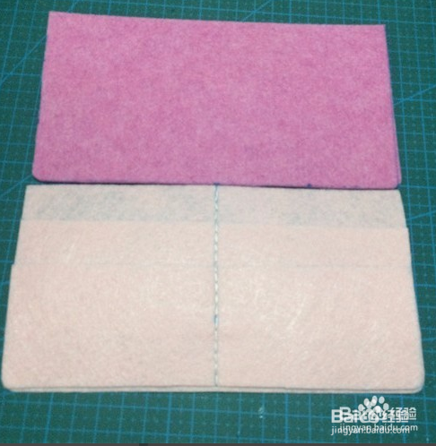 取3片粉色不织布,画上中央参考线,如图叠放好。用平针缝合三层不织布