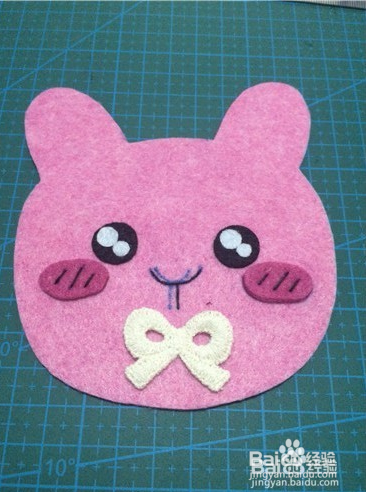 取兔子正面,缝上眼睛,腮红,鼻子。贴布绣缝上水溶蕾丝蝴蝶结。兔子头背面缝上拉链