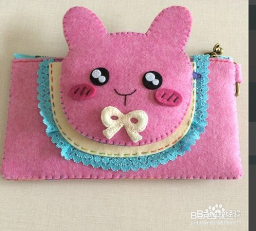 兔子头正面和背面叠放一起,用锁边针缝合。缝好的兔子头放在奶黄色不织布上,看下大概的位置.然后在对应的位置贴上魔术贴,一个可爱的兔子钱包就做好了