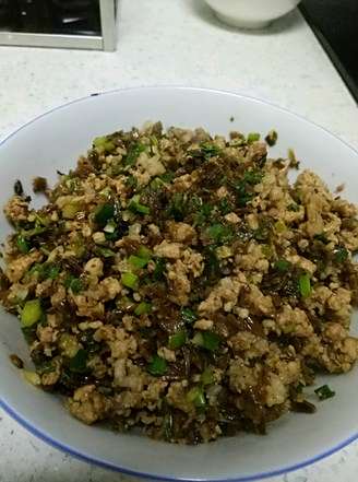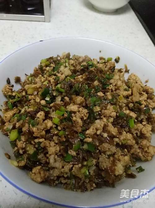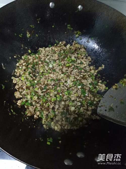 锅下少许油,下猪肉炒,然后放入芽菜,葱。因为芽菜有咸味炒好后尝一下合适就不用再加盐