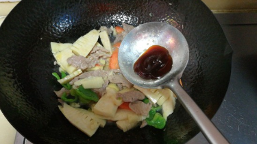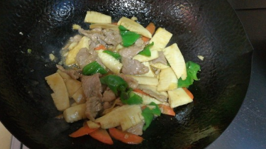 翻炒至猪肉片变色出香味后放入胡萝卜片