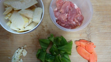 将冬笋去除外皮后切片,然后用水焯一下,这样可以去除它的涩味,而且缩短炒的时间,猪肉切片后用少量盐和淀粉拌匀,这样炒出来的肉嫩而不老,而且很入味,胡萝卜切片,青椒切块,大蒜切碎