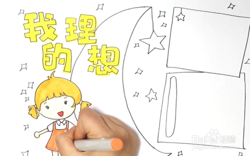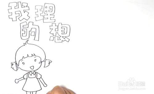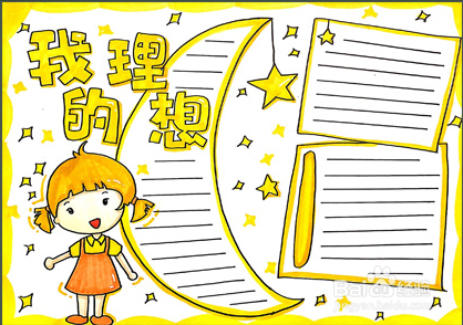 首先在手抄报左上方写上我的理想的主题报头,接着在报头下方,画一个小女孩。