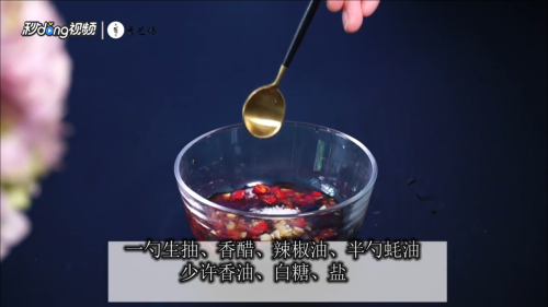 加入生抽、香醋、辣椒油、蚝油、香油、白糖、盐,搅拌均匀。