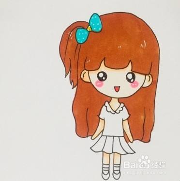 首先画出小女孩的头发,然后画侧面扎着的辫子,绑着蝴蝶结,再画出小女孩的五官,往下画出她的身体,穿着短袖和裙子,先给小女孩的头发涂上棕色,蝴蝶结涂上蓝色,衣服也涂上颜色,简单又可爱的小女孩简笔画就完成啦!
