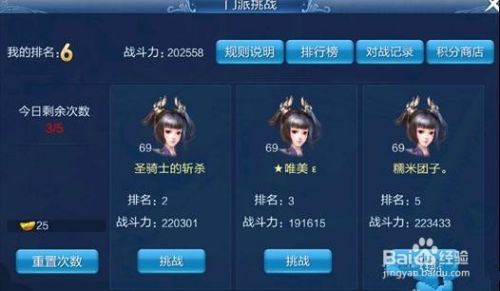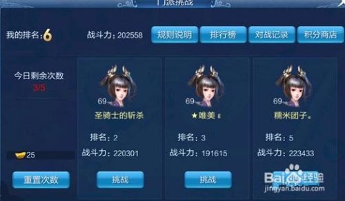 门派内的比武,每天可挑战5次,每日结算排名,排名积分可兑换金刚钻、吴山石、藏宝图等。