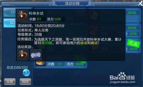 限时任务:帮会任务(帮会大盗、货运任务、行酒令)、科举考试、关宁校场、吉星高照、采薇任务。