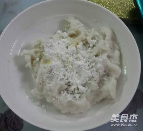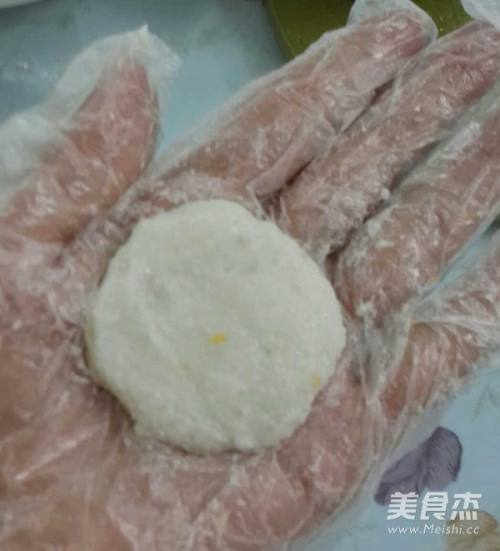 4带上一次性手套,取适量山药泥捏成稍厚的圆片