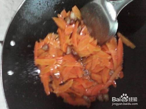 接下来,我们将”胡萝卜片“倒入跟五花肉一起炒,炒至半成。如下图所示