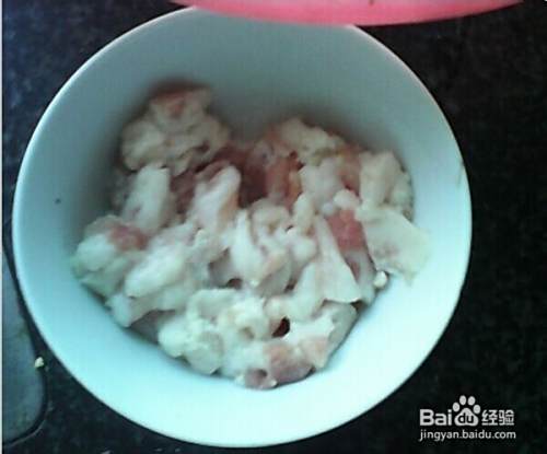 然后将锅里放入”油“适量,待油热后,将”五花肉“倒入,进行翻炒 ,翻炒至半成黄即可。如下图所示