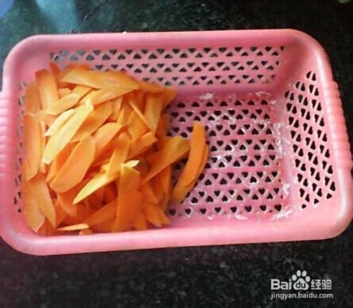 首先,把“胡萝卜”洗净,将胡萝卜表皮“削去”,在切成“小片”。如下图所示