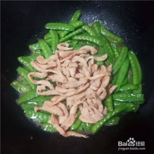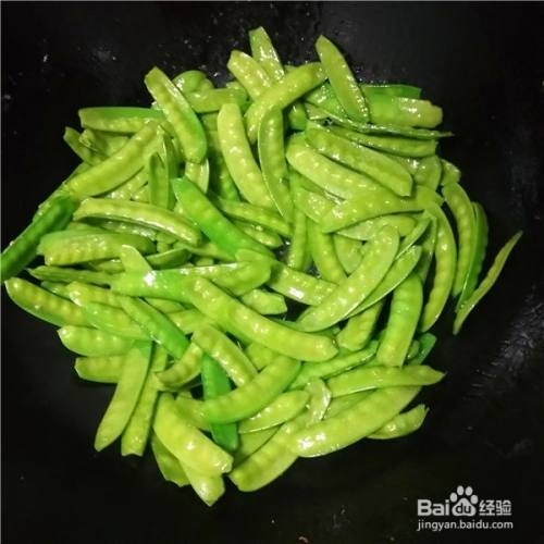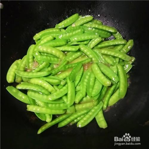 4、另起锅倒油,倒入豌豆,调入盐、醋和白糖大火翻炒。