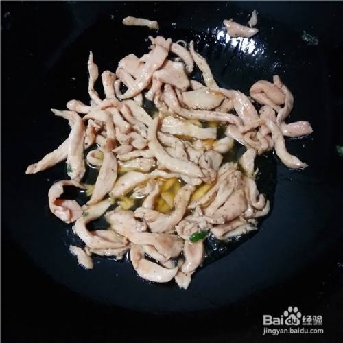3、锅中倒油烧热,倒入鸡肉滑炒至白色盛出来。