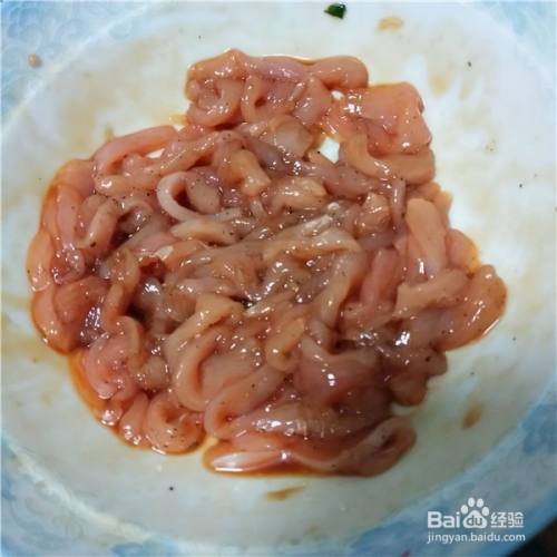 2、鸡肉切丝后,加入料酒、黑胡椒粉、蚝油、盐和生粉,抓匀腌10分钟。