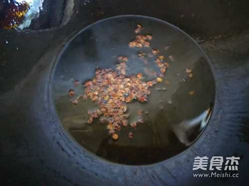 7锅加油烧热,下入花椒,中小火炸至微焦,将花椒捞出不用