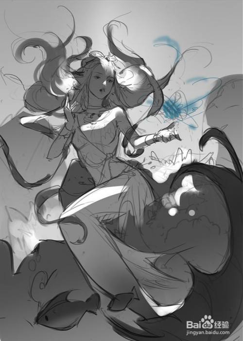 顺下来这步开始刻画画面中的次重要部分,比如鱼尾人物周围的珊瑚等衬托的道具,这部分的重点是找清楚光白方向。