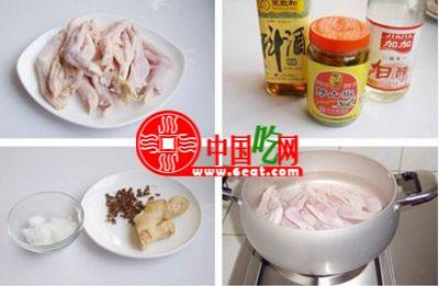 2、开水中加白醋和少许盐,把鸭掌焯熟后放入凉水中;