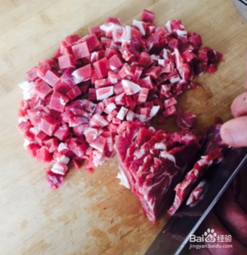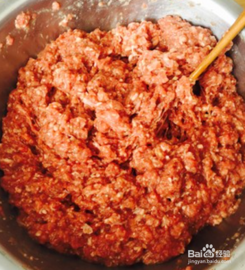 加适量水到肉馅中并往同一个方向用力搅拌以使肉馅上劲。