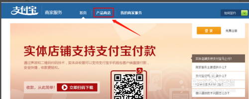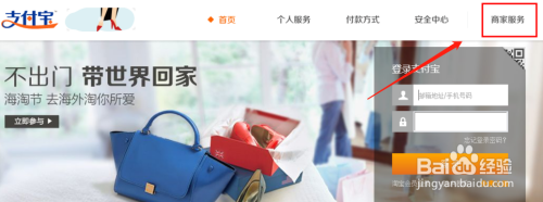 点击进入支付宝官方网站首页,在页面的左上角找到商家服务,找到后直接点击进入。