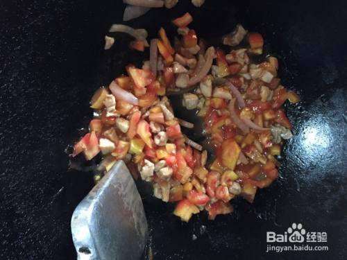 炒到肌肉变白,倒入切好的番茄丁和番茄酱,小火煸炒5分钟左右
