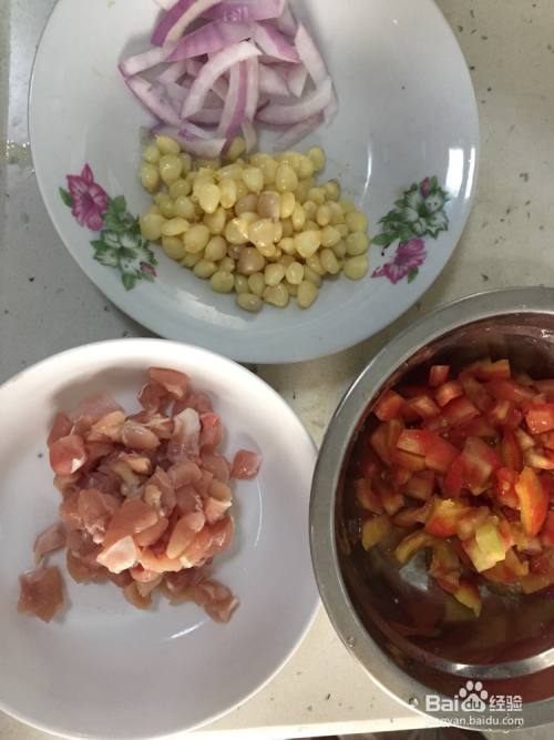 准备好的食材都切好。 因为起晚了,没有买到豌豆就用玉米代替了