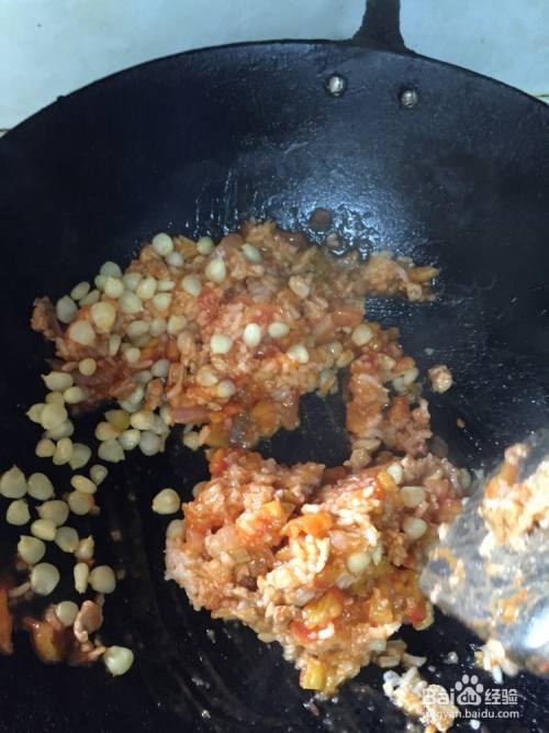 倒入玉米粒,中大火三分钟左右。配菜都可以按照自己喜欢添加哦~盛出饭备用