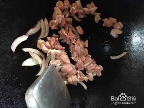 锅里热好黄油,放入洋葱煸炒,洋葱稍微变黄后,倒入鸡肉