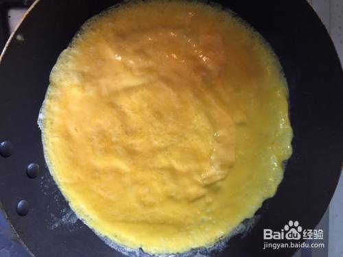 倒入蛋液,小火大约2到3分钟,看到底部成型,表面略微有些不成型,就可以关火咯。将饭放在一边,是月牙形。放在中间,是方形。