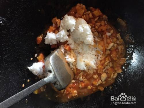 倒入米饭,(家里因为有老人米饭蒸的比较软,亲们准备硬一点的米饭更好),煸炒到米饭稍稍变软