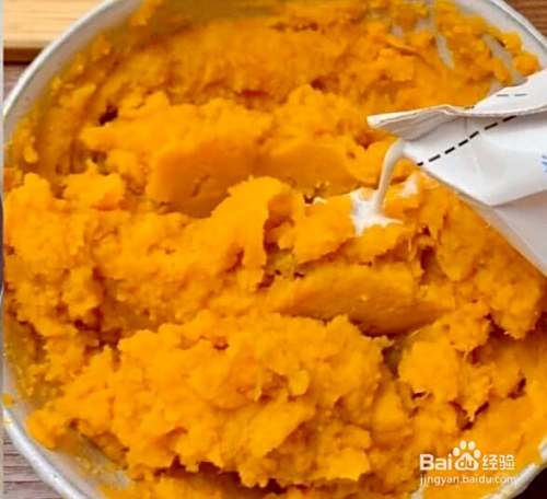 蒸熟放入碗中冷却后,压成泥,加入100ml牛奶,搅拌混合均匀。